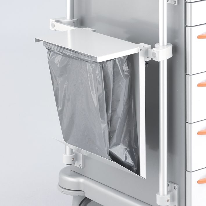 280 x 110 x 410 mm (B x T x H) aus Stahlblech, pulverbeschichtet weißaluminium RAL 9006, mit Schienenkloben aus Kunststoff, zur Aufnahme von 15-Liter-Abfallbeutel in Rollenform. Lieferung mit 1 Rolle Abfallbeutel Nr. 202.2070.0. Nutzmaß 300 mm.