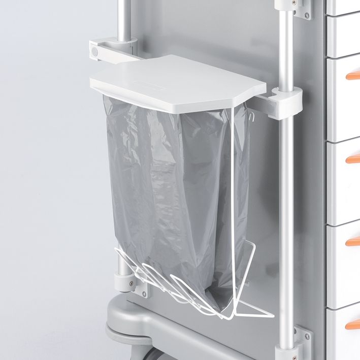 265 x 205 x 425 mm (B x T x H), aus Draht rilsaniert, mit Deckel aus Kunststoff, zur Aufnahme von 15-Liter-Abfallbeutel in Rollenform, mit Halterung aus Stahl, pulverbeschichtet weißaluminium RAL 9006, mit Schienenkloben aus Kunststoff, Lieferung mit 1 Rolle Abfallbeutel Nr. 202.2070.0. Nutzmaß 300 mm.