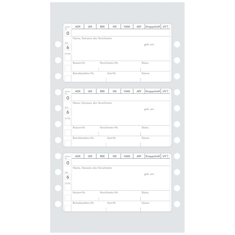 Für alle Karteikarten / -taschen / -mappen geeignet, Stammdatenfeld gemäß eGK, selbstklebend, Lochrandetiketten zum endlosen Bedrucken, Perforation nach jedem Etikett, Etikettmaß 89 x 48 mm, Trägerpapier 113 mm breit. Nur für Nadeldrucker geeignet.