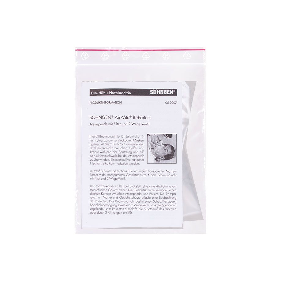 Mit 2-fach Sicherheit. Kein direkter Kontakt von Helfer und Patient während der Beatmung, kein Verletzungsrisiko in der Anwendung durch Laienhelfer. Dicht abschließende, anatomiegerecht geformte Mund-Nase-Maske, transparente Gesichtsschürze und Beatmungsrohr mit 2-Wege-Ventilsystem und Sekretfilter, einfach zusammenzustecken.