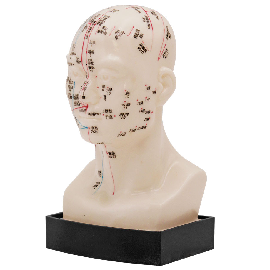 Akupunkturmodell des menschlichen Kopfes aus Kunststoff mit einer weichen, hautähnlichen Oberfläche; die einzelnen Akupunkturpunkte und Meridiane sind mehrfarbig angelegt, das Modell ist ideal zum Üben und Veranschaulichen der einzelnen Therapieformen; ganz nebenbei werden neue Patienten durch dieses Modell darauf aufmerksam gemacht, dass Akupunktur als Therapieform in der Arztpraxis angeboten wird.