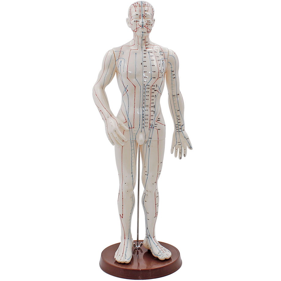 Akupunkturmodell des menschlichen Körpers aus Kunststoff mit einer weichen, hautähnlichen Oberfläche; die einzelnen Akupunkturpunkte und Meridiane sind mehrfarbig angelegt, das Modell ist ideal zum Üben und Veranschaulichen der einzelnen Therapieformen; ganz nebenbei werden neue Patienten durch dieses Modell darauf aufmerksam gemacht, dass Akupunktur als Therapieform in der Arztpraxis angeboten wird.