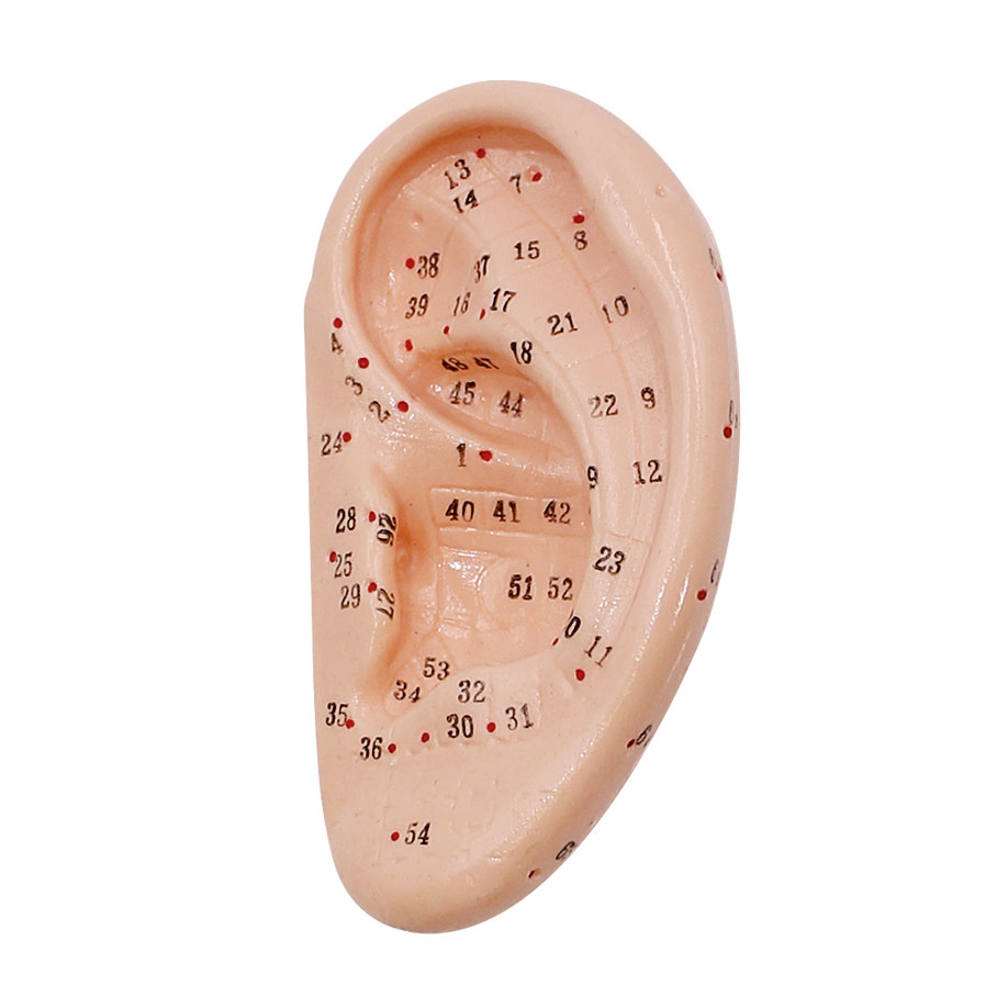 Akupunkturmodell des menschlichen Ohrs aus Kunststoff mit einer weichen, hautähnlichen Oberfläche; die einzelnen Akupunkturpunkte und Meridiane sind durch rote Punkte angelegt, das Modell ist ideal zum Üben und Veranschaulichen der einzelnen Therapieformen, ganz nebenbei werden neue Patienten durch dieses Modell darauf aufmerksam gemacht, dass Akupunktur als Therapieform in der Arztpraxis angeboten wird.