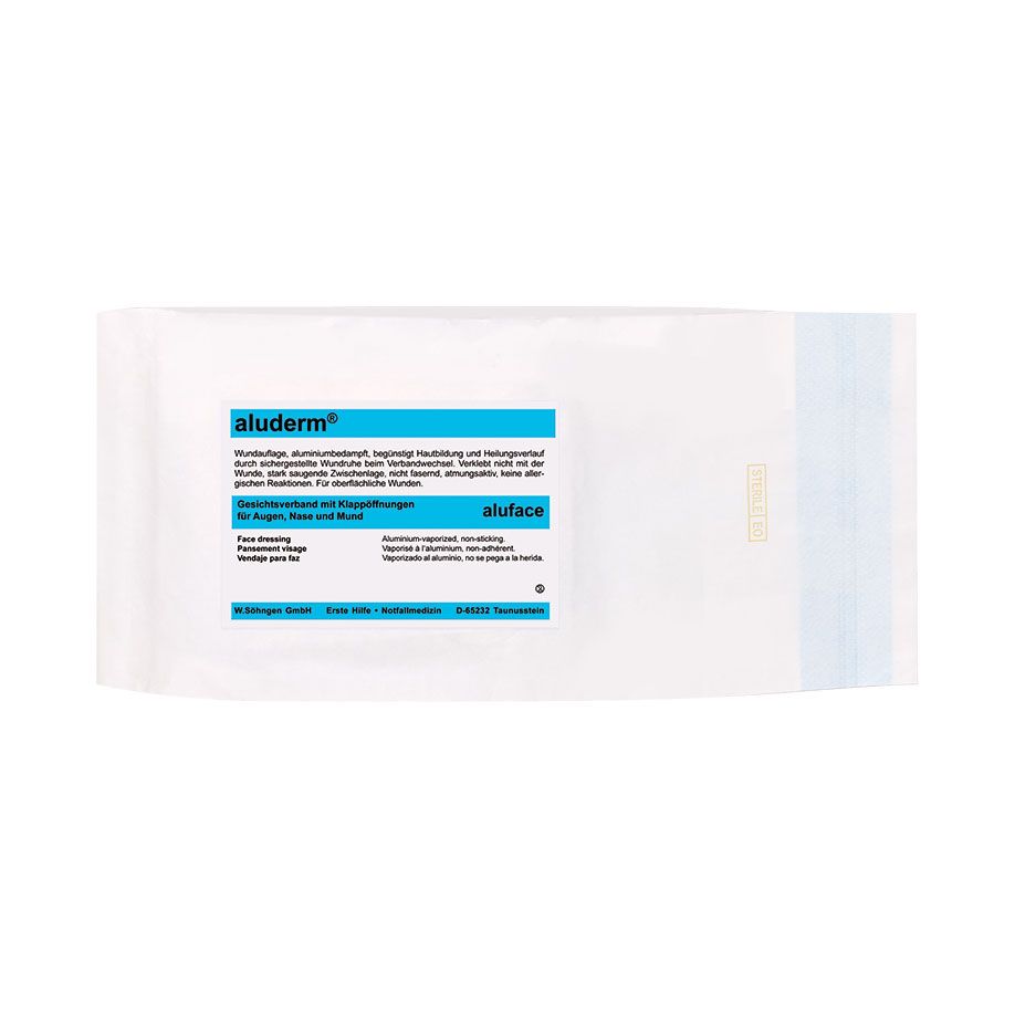 Gebrauchsfertige aluderm®-Gesichtsmaske zur Abdeckung großflächiger Verletzungen im Gesicht. Vorgestanzte Bereiche für Augen, Mund und Nase, das Gesicht ist komplett abgedeckt, die Atemöffnungen bleiben frei. Einzeln steril verpackt.
