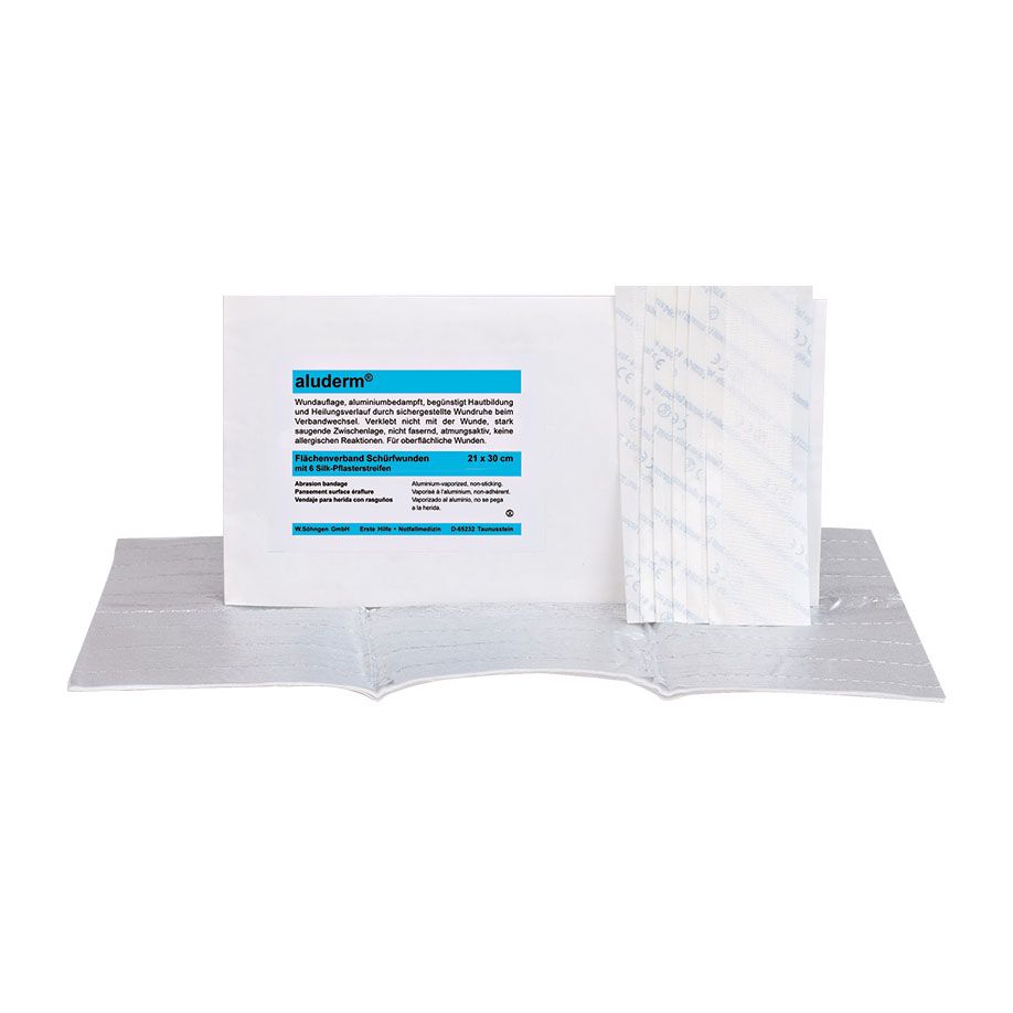 Aluminiumbedampfter aluderm® Flächenverband zur lockeren Abdeckung von Hautabschürfungen. Inkl. hautfreundlichen Silk-Pflasterstreifen à ca. 12 x 2,5 cm, steril verpackt. aluderm Kompresse ca. 21 x 30 cm + 6 Silk-Pflasterstreifen.