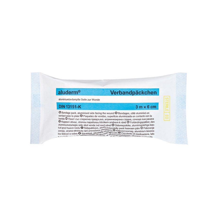 Aluminiumbedampfte aluderm®-Kompresse mit starker Sauglage, aufgesiegelt auf eine elastische WS-Fixierbinde, stranguliert nicht. SÖHNGEN®-No-Touch-Wicklung. Einzeln steril verpackt. Binde ca. 3 m (ged.) x 6 cm, Kompresse ca. 6 x 8 cm