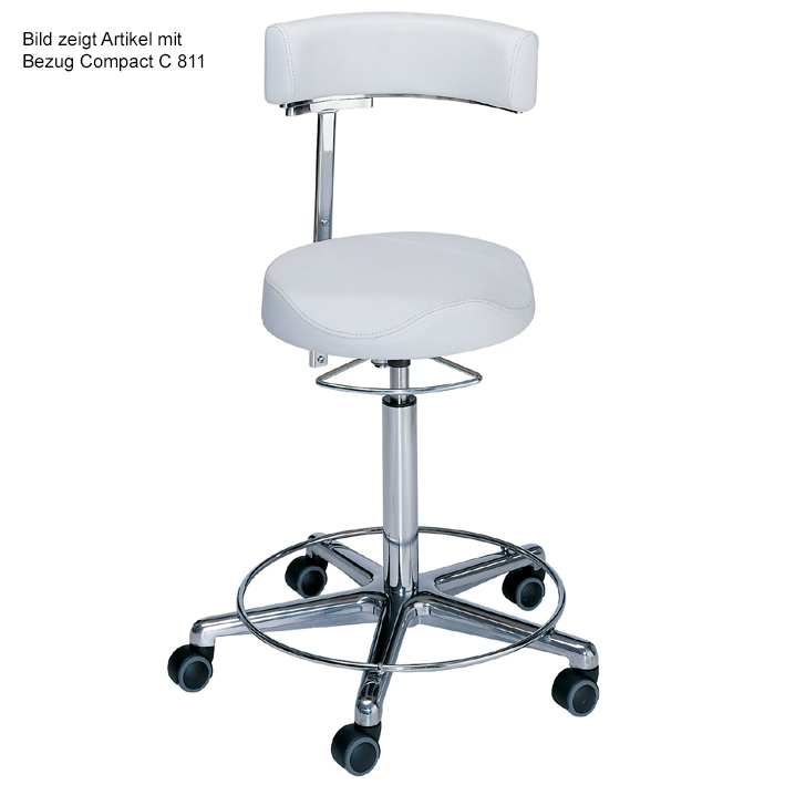 Mit anatomisch geformter Sitzkante und Ringauslösung, mit gebremsten Sicherheitsrollen und Lehne, in der Höhe einstellbar, Lehne ca. 180° schwenkbar und mechanisch in der Höhe und Neigung zu verstellen, Sitz 40 cm gepolstert, Hochglanzpolierter Aluminiumkreuzfuss, Stahlteile dauerhaft verchromt.