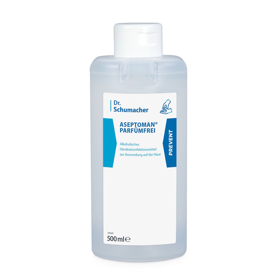 Alkoholisches Händedesinfektionsmittel zum Einreiben in die Haut. ASEPTOMAN® PARFÜMFREI ist besonders hautverträglich und parfümfrei. Darüber hinaus enthält ASEPTOMAN® PARFÜMFREI hochwertige rückfettende Inhaltstoffe, die eine Austrocknung der Haut vermindern.