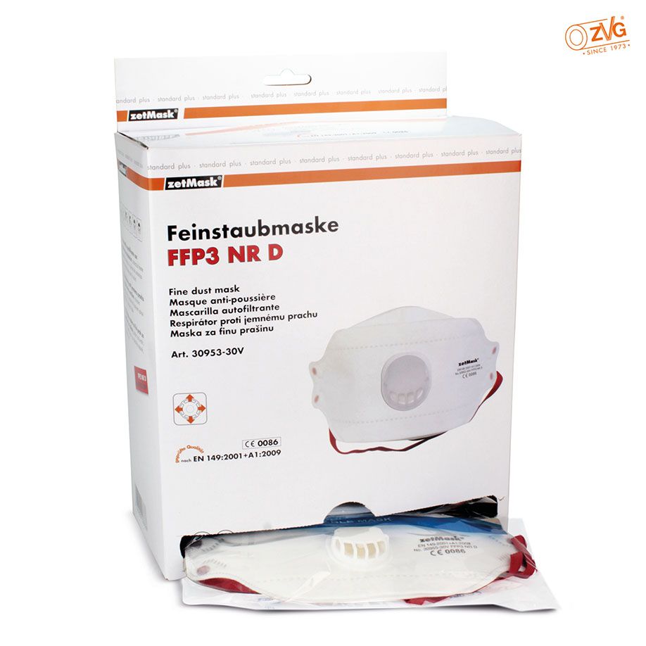 Einweg-Atemschutzmaske mit Ausatemventil zum Schutz gegen feste und flüssige Partikel gesundheitsschädlicher, giftiger Stoffe wie Sporen, Bakterien etc., z.B. für den Einsatz in Müllverbrennungsanlagen, in der Pharmaindustrie oder im chemisch-technischen Bereich