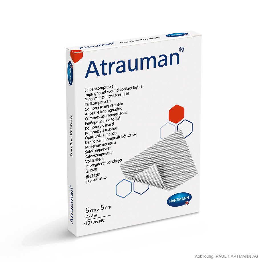 Wirkstofffreie Salbenkompressen für den Einmalgebrauch zur Behandlung von oberflächlichen akuten und chronischen Wunden jeglicher Art. Als nicht verklebende Wundkontaktschicht ist der Verband besonders geeignet, um ein Verkleben des Sekundärverbands mit dem Wundbett zu vermeiden, außerdem sorgt er dafür, dass die Wundränder und die Umgebungshaut geschmeidig bleiben. Durch die neutralen Eigenschaften der wirkstofffreien Salbenmasse ist Atrauman® besonders gut in der Dermatologie sowie bei haut- und medikamentenempfindlichen Patienten anwendbar. Einzeln eingesiegelt.