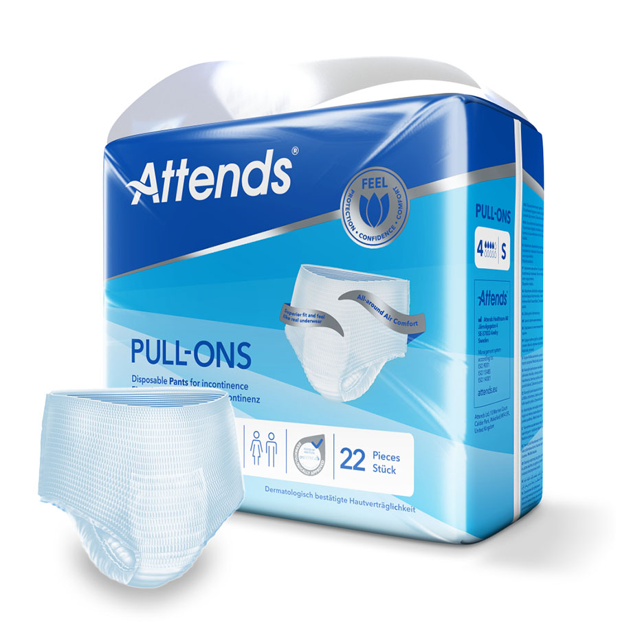 Attends® Pull-Ons sind weiche und diskrete saugfähige Einmalhosen, die sich wie Unterwäsche anfühlen. Sie können ganz einfach an- und wieder ausgezogen werden und sind bei mittlerer Harninkontinenz geeignet.