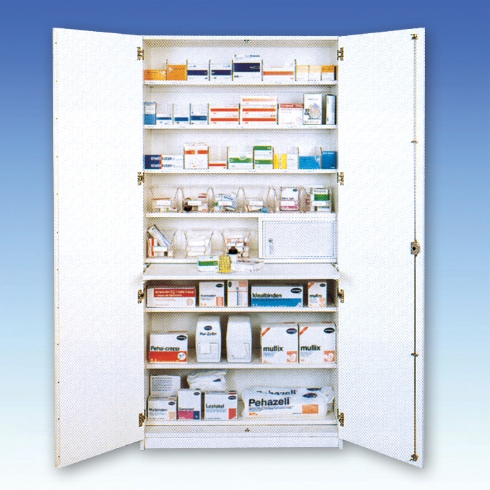 Das Grundmodell ist für die Einrichtung aller Stationszimmer in Altenpflegeheimen und Krankenhäusern sowie für Arztpraxen konzipiert. Die Grundausstattung besteht aus 8 verstellbaren Flachböden (aus Holz) mit einer Tiefe von 300 mm, sowie einem abschließbarem Wertfach aus Holz. Eine stabile, ausziehbare Arbeitsplatte in Schrankbreite erleichtert das Ein- und Aussortieren von Medikamenten. Der Schrank ist mit einem Sicherheits-Drehzylinderschloss ausgestattet. Maße: H 205 x B 100 x T 50 cm.