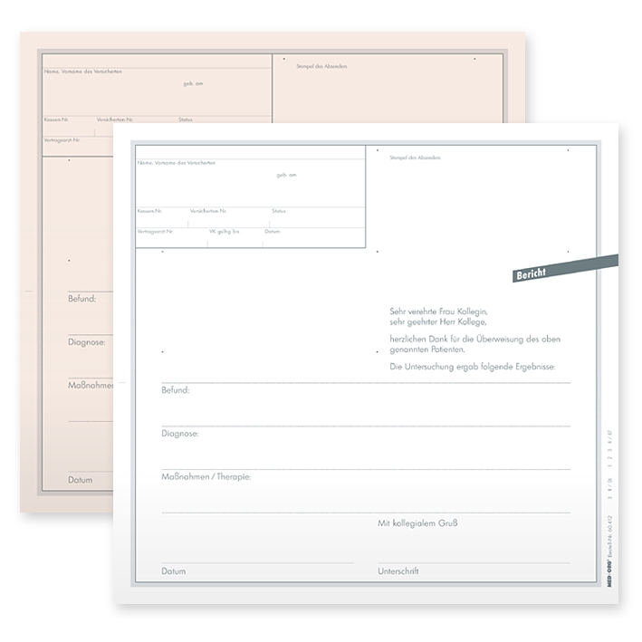 Format 210 mm x 200 mm, Durchschreibesatz, 1. Blatt 80 g holzfrei weiß, 2. Blatt 60 g holzfrei rosa, einseitig bedruckt, grauer Druck, am Kopf geleimt, ungelocht.