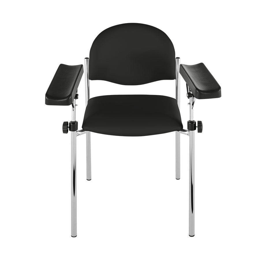 Blutentnahmestuhl mit abwischbarem Polsterbezug aus Kunstleder. Die 2 Armauflagen aus Integralschaum sind rundherum drehbar, in der Neigung stufenlos fixierbar und in der Höhe variabel einstellbar.