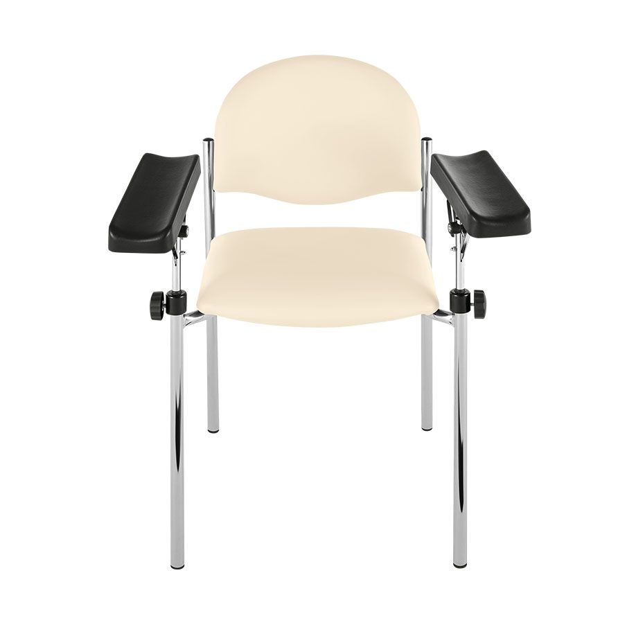 Blutentnahmestuhl mit abwischbarem Polsterbezug aus Kunstleder. Die 2 schwarzen Armauflagen aus Integralschaum sind rundherum drehbar, in der Neigung stufenlos fixierbar und in der Höhe variabel einstellbar.