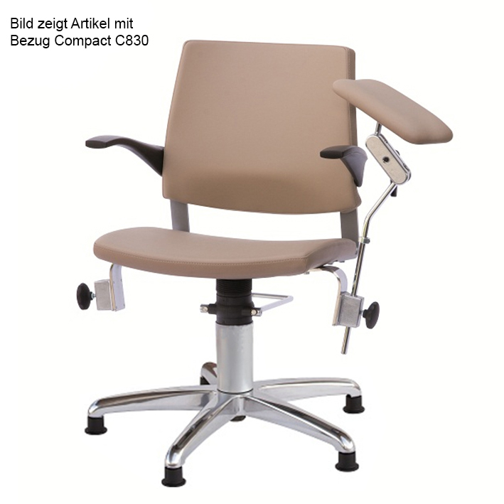 Die Rückenlehne ist beweglich, mit Armlehnen aus schwarzem Integralschaum und einer Halterung links und rechts für die vielseitig einstellbare Blutentnahme-Armauflage (eine zweite Blutentnahme-Armauflage kann optional dazu bestellt werden), das Oberteil um 360° dreh- und feststellbar. Die Höhenverstellung erfolgt durch eine hydraulische Pumpe mit 17 cm Hub, die auf einem 5-teiligem Kreuzfuß aus poliertem Aluminium mit Gleitern fixiert ist. Die Säule hat einen Durchmesser von 85 mm. Alle Stahlteile sind verchromt.