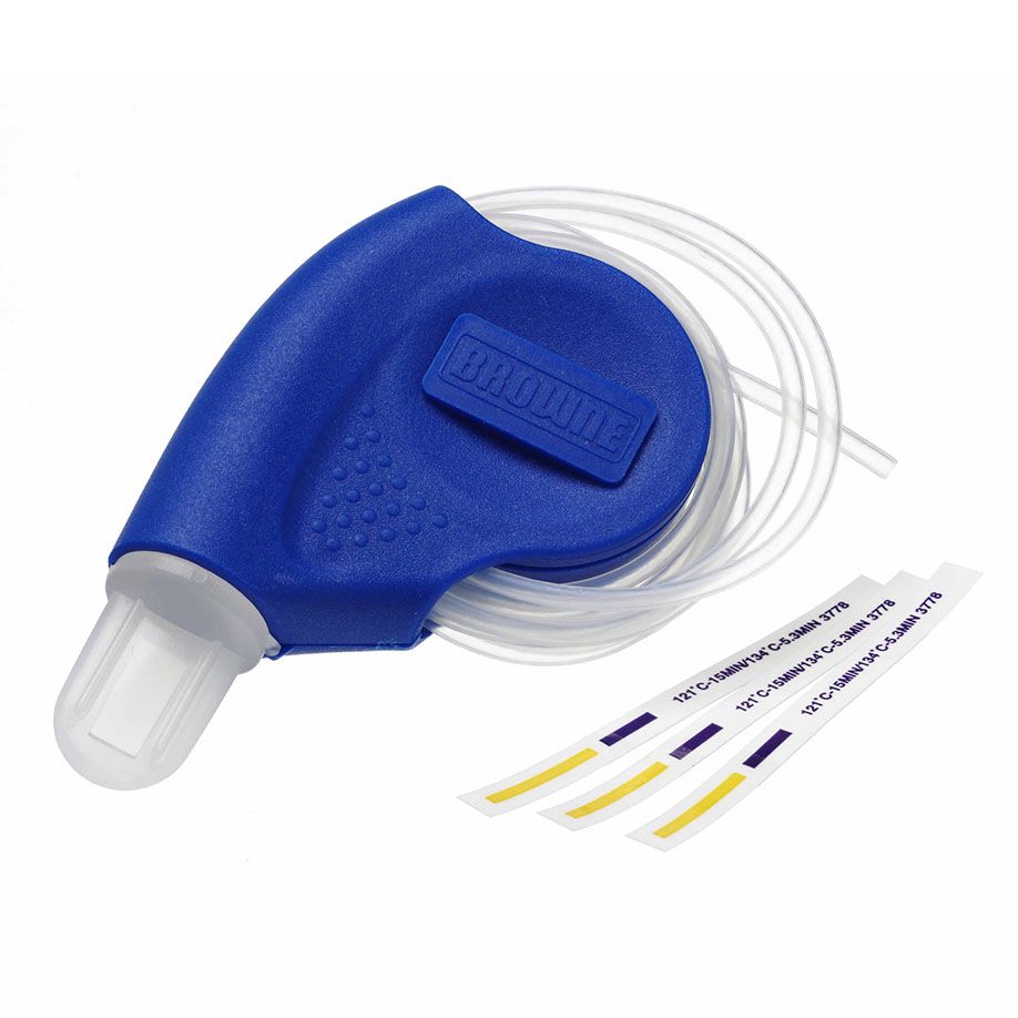 Chargenkontrolle 134°C bei einer Haltezeit von 5,3 Minuten / 121°C bei 15 Minuten für die Dampfsterilisation. Das Chargenkontrollprodukt ist so konzipiert, dass es nur bei einer guten Dampfdurchdringungsleistung des Sterilisators vom Dampf durchdrungen wird. Wenn der Indikator im Prüfkörper der definierten Kombination von Temperatur und Dampf über den vorgegebenen Zeitraum ausgesetzt wird, zeigt er einen deutlichen Farbumschlag von gelb zu blau/violett.