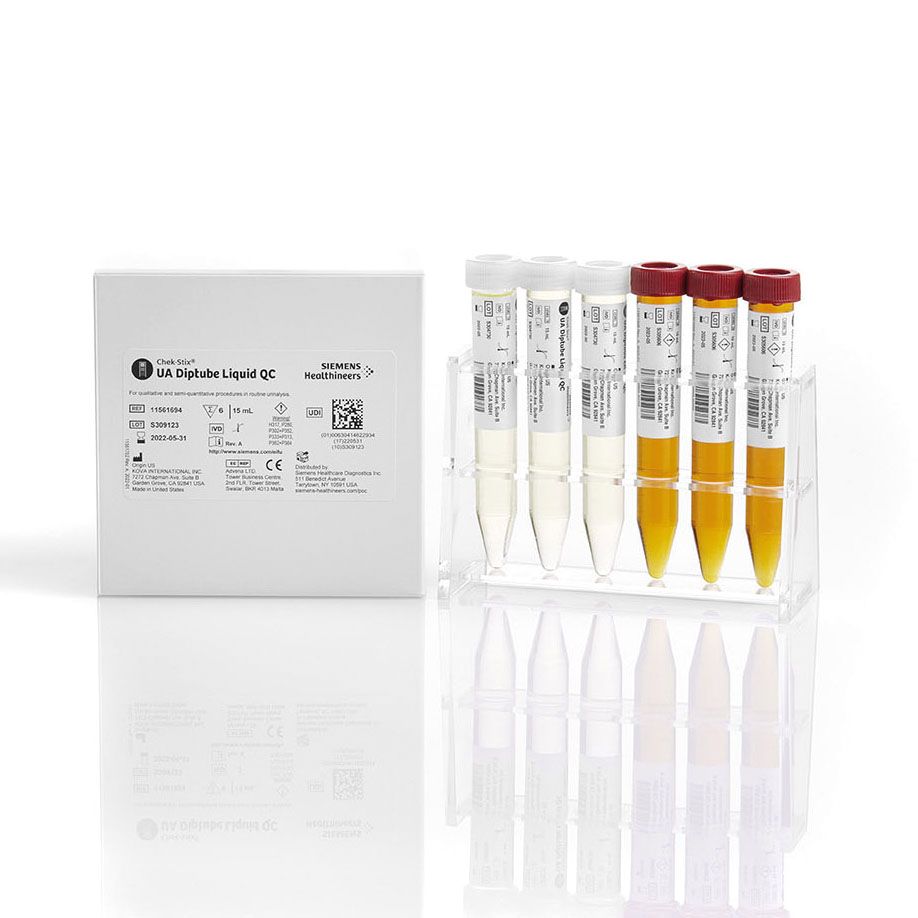 Die Chek-Stix UA Diptube flüssige Qualitätskontrolle beinhaltet sowohl Level-1-Kontrollmaterial (negativ für alle chemischen Parameter und positiv für hCG) als auch Level-2-Kontrollmaterial (positiv für alle chemischen Parameter und negativ für hCG) in einer einzigen Packung. Bei den Level-1- und der Level-2-Diptube-Kontrollen handelt es sich um gebrauchsfertiges flüssiges QK-Material zur Verwendung sowohl auf den CLINITEK Status®+, CLINITEK Advantus® und Atellica LumIQ Analysesystemen als auch mit Harnteststreifen zur visuellen Ablesung.