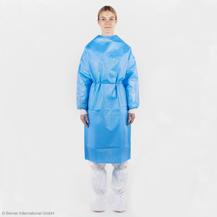 Persönliche Schutzausrüstung (PSA) der höchsten Kategorie III Typ PB-[4]/Typ PB [4]-B zum Schutz gegen Chemikalien, Zytostatika & biologische Arbeitsstoffe, zertifiziert nach PSA-Verordnung (EU) 2016/425, bietet bewährten Teilkörperschutz mit Strickbündchen, vollständig geschlossener Vorderseite, extra langem Schnitt und hochgezogenem Halsausschnitt. Fusselarmes Material (gesponnenes Polypropylenvlies), Ärmel und Kittelvorderseite sind flüssigkeitsundurchlässig beschichtet (Polyethylen), somit wird eine Kontamination der Haut bzw. der Kleidung verhindert, praktischer Klettband-Verschluss im Nacken, Wickelbänder sowie eingearbeitete Strickbündchen in den Ärmeln mit 3-fach ultraschallgeschweißter Naht für eine höhere Schutzfunktion, für die Körpergröße 176 - 194 cm