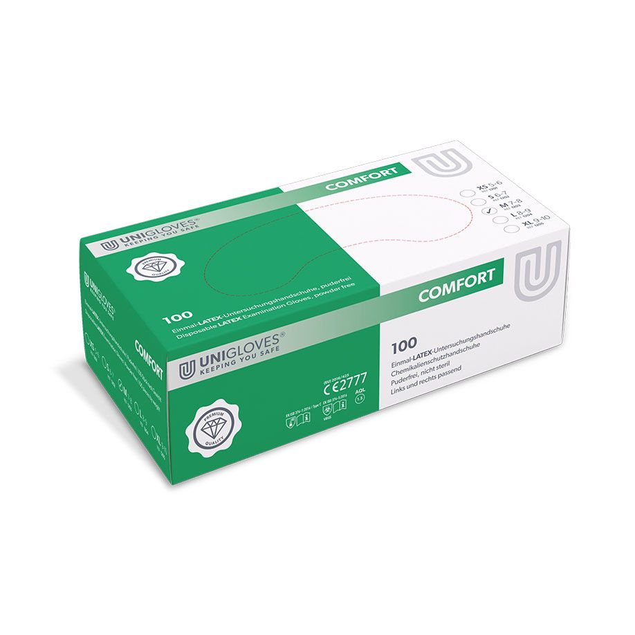 Unigloves COMFORT® ist ein aus Latex gefertigter Hygiene- und Schutzhandschuh, der vor allem im medizinischen und pflegerischen Bereich zum Einsatz kommt. Der angenehm glatte Einweghandschuh wurde nach der PSA-Verordnung (EU) 2016/425 sowie den europäischen Normen EN 374, EN 420 und EN 455 getestet. Das strapazierfähige Material ist wasserdicht und bietet Schutz gegen Viren, Pilze und Bakterien. Der Latex ist mit einem Proteingehalt von weniger als 50 µg/dm² besonders hautfreundlich. Die flexible Passform gewährleistet zudem einen hohen Tragekomfort. Dank der Chlorinierung und dem stabilen Rollrand lässt sich der ungepuderte Handschuh problemlos an- und ausziehen. Das beidhändige Design des Handschuhs ermöglicht einen schnellen und häufig wechselnden Gebrauch.