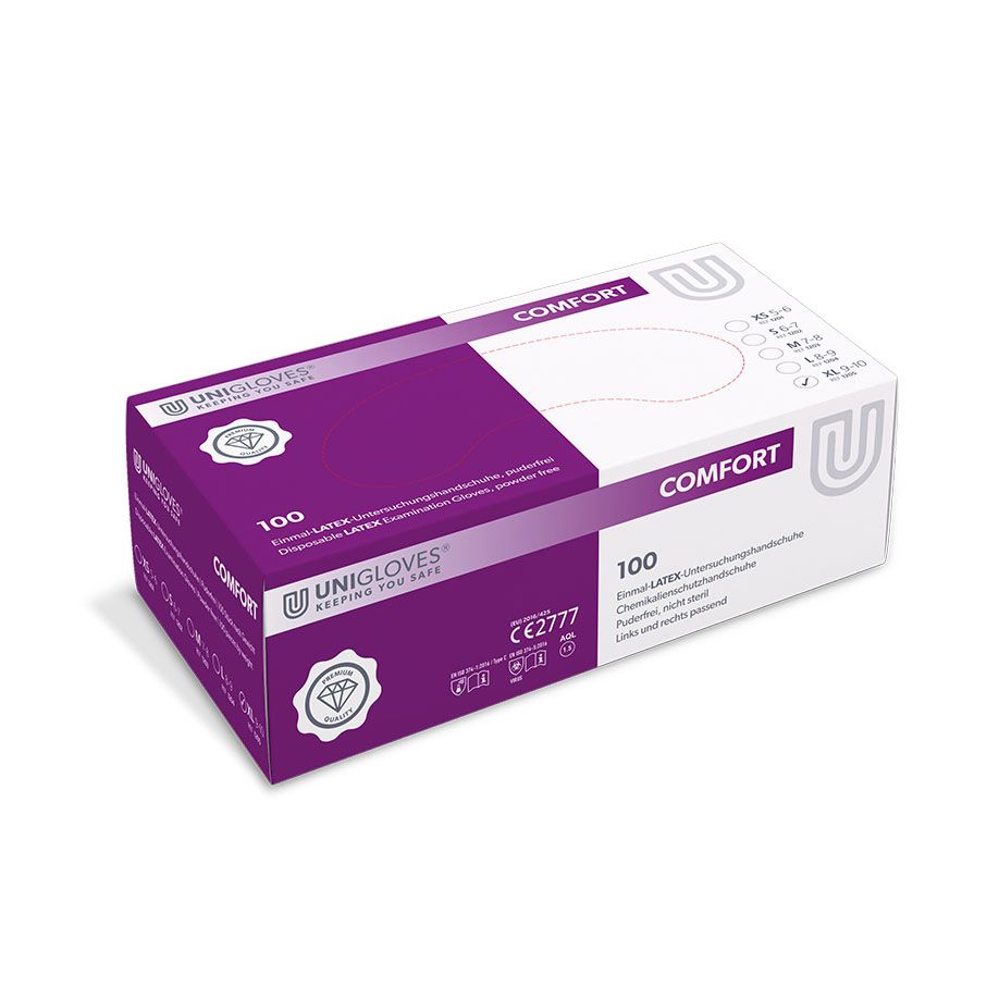 Unigloves COMFORT® ist ein aus Latex gefertigter Hygiene- und Schutzhandschuh, der vor allem im medizinischen und pflegerischen Bereich zum Einsatz kommt. Der angenehm glatte Einweghandschuh wurde nach der PSA-Verordnung (EU) 2016/425 sowie den europäischen Normen EN 374, EN 420 und EN 455 getestet. Das strapazierfähige Material ist wasserdicht und bietet Schutz gegen Viren, Pilze und Bakterien. Der Latex ist mit einem Proteingehalt von weniger als 50 µg/dm² besonders hautfreundlich. Die flexible Passform gewährleistet zudem einen hohen Tragekomfort. Dank der Chlorinierung und dem stabilen Rollrand lässt sich der ungepuderte Handschuh problemlos an- und ausziehen. Das beidhändige Design des Handschuhs ermöglicht einen schnellen und häufig wechselnden Gebrauch.