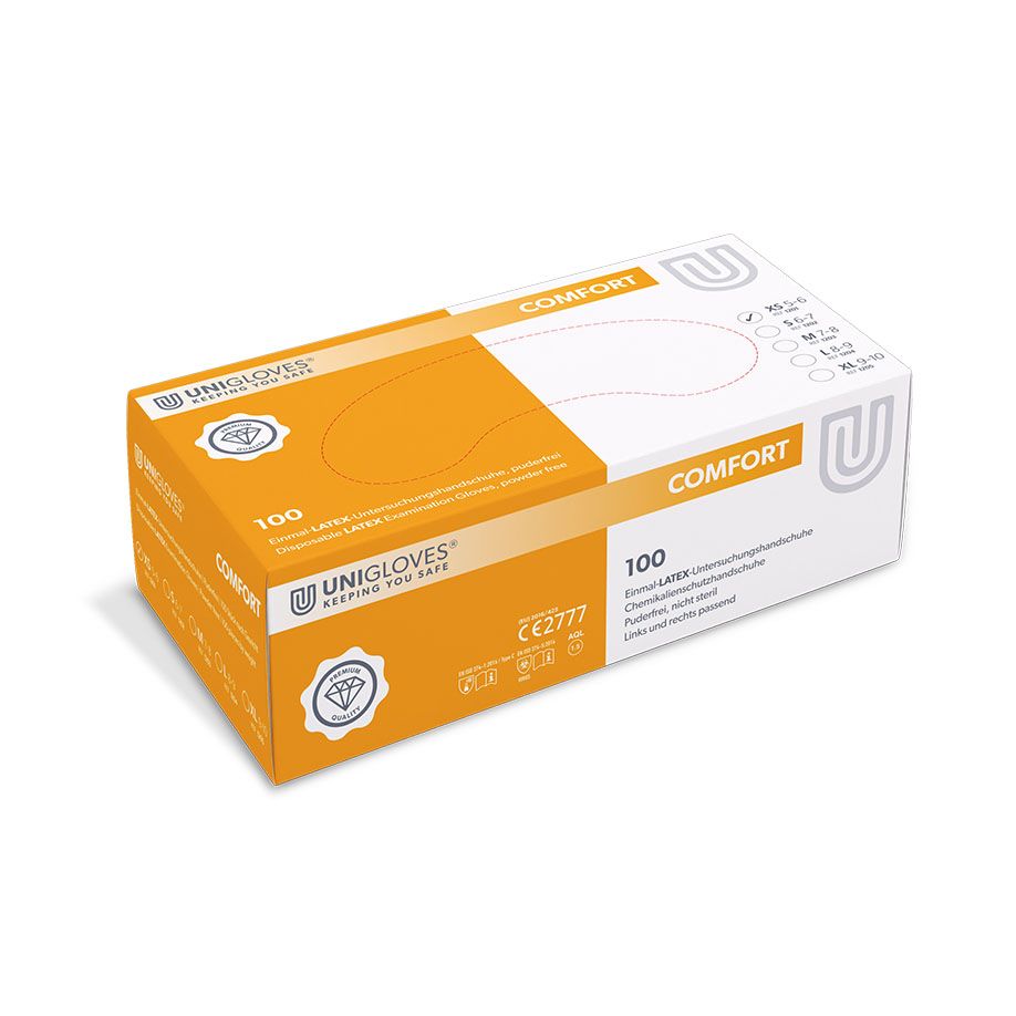 Unigloves COMFORT® ist ein aus Latex gefertigter Hygiene- und Schutzhandschuh, der vor allem im medizinischen und pflegerischen Bereich zum Einsatz kommt. Der angenehm glatte Einweghandschuh wurde nach der PSA-Verordnung (EU) 2016/425 sowie den europäischen Normen EN 374, EN 420 und EN 455 getestet. Das strapazierfähige Material ist wasserdicht und bietet Schutz gegen Viren, Pilze und Bakterien. Der Latex ist mit einem Proteingehalt von weniger als 50 µg/dm² besonders hautfreundlich. Die flexible Passform gewährleistet zudem einen hohen Tragekomfort. Dank der Chlorinierung und dem stabilen Rollrand lässt sich der ungepuderte Handschuh problemlos an- und ausziehen. Das beidhändige Design des Handschuhs ermöglicht einen schnellen und häufig wechselnden Gebrauch.