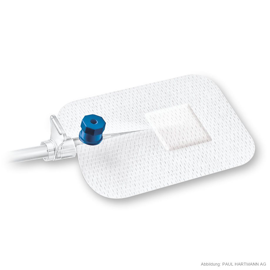 selbstklebender Kanülenfixierverband aus weichem Trägervlies mit spezialbeschichtetem, nicht verklebendem Wundkissen, zusätzliches, separates Polsterkissen als Schutz gegen Druckstellen durch die Venenverweilkanüle, hautfreundlich durch hypoallergenen, synthetischen Kautschuk-Kleber, einzeln eingesiegelt