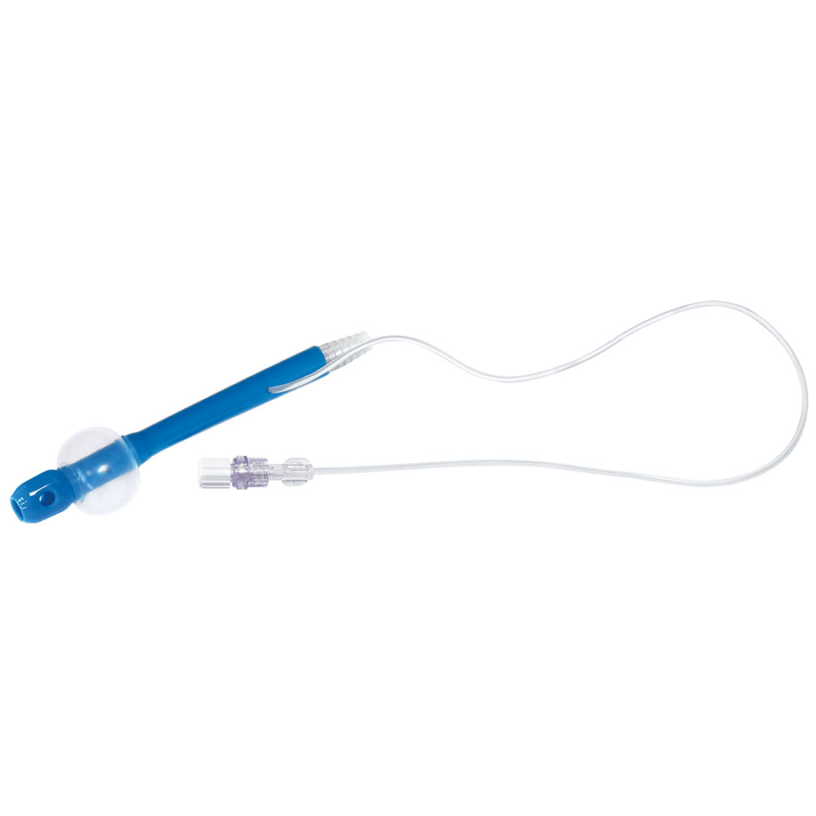 nur zum Einmalgebrauch, blau, einteilig mit Olive (Ø 16 mm), Ø Innen (Lumen): ca. 8 mm, innenliegende Luftzufuhr, mit transparentem Rückschlagventil, konischer Schaft aus weichem, flexiblen PVC, weicher Silikonballon mit Luer-Lock Anschluss, zentrale Öffnung und 2 seitliche Augen, mit transparentem Stufenkonnektor, Länge 15,5 cm
