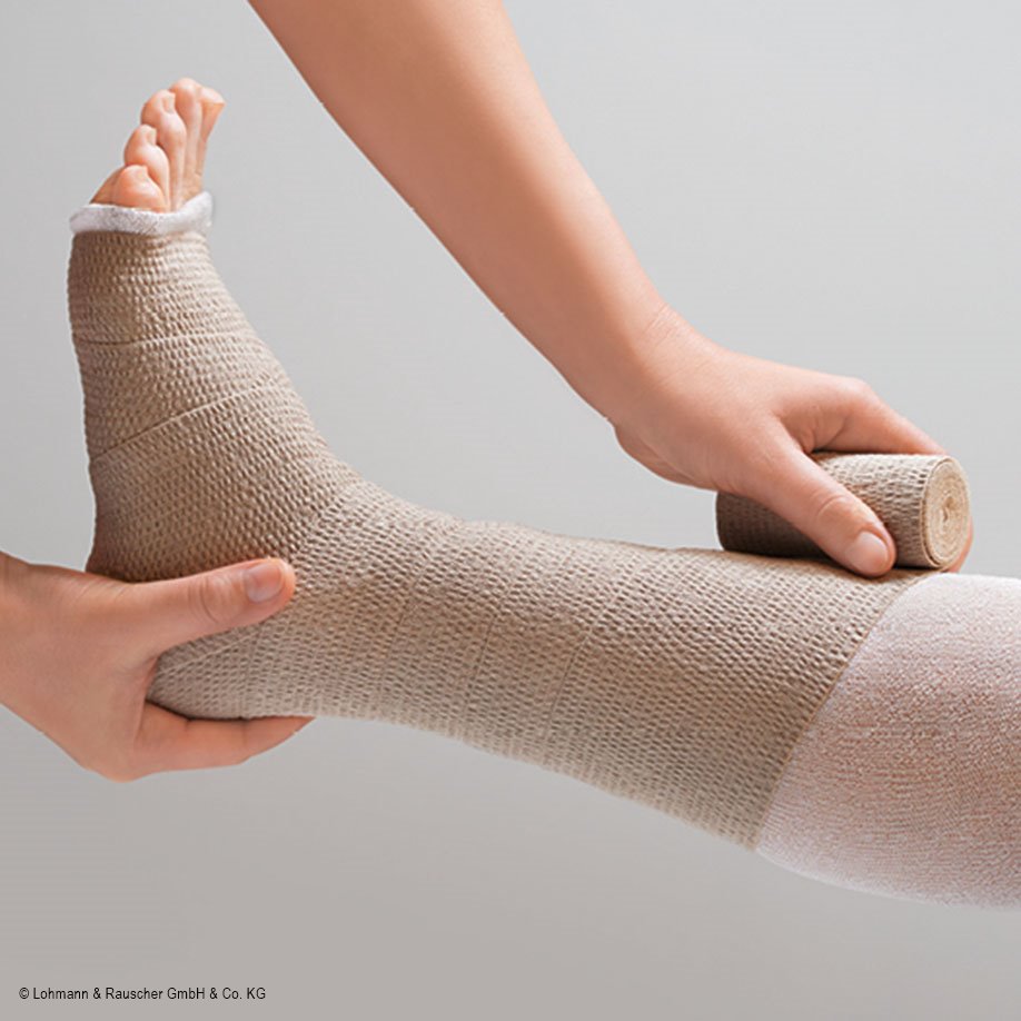 - cremefarbene Langzugbinde zum Stützen und Entlasten des Stütz- und Bewegungsapparates