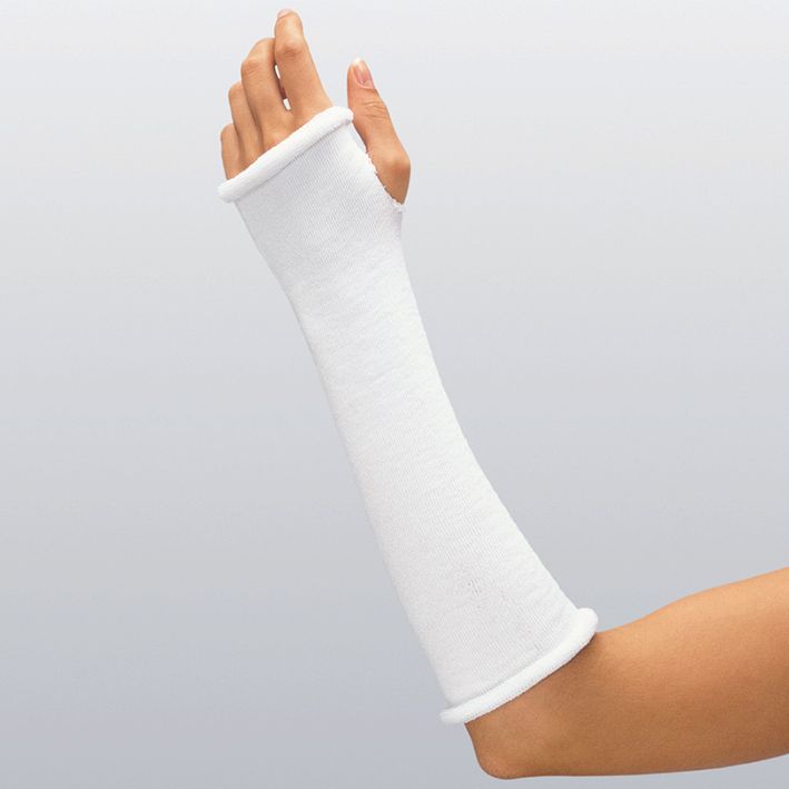 Besteht aus 95 % Polyester, 3 % Nylon und 2 % Spandex. Zur Unterpolsterung von synthetischen Starr- und Stützverbänden jeder Art und Größe, Abpolsterung von Schienen, Unterzug für die funktionelle Casttherapie (FCT).