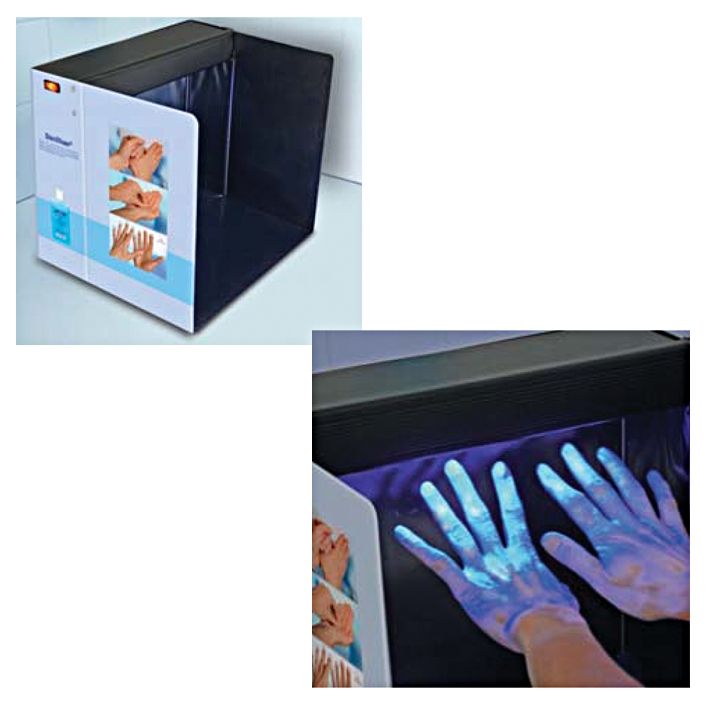 besteht. Für den Einsatz bei Schulungen wird der Ordner einfach auseinandergefaltet. Mit nur wenigen Handgriffen entsteht eine gebrauchsfertige UV-Box. Die Platz sparenden Maße (offen: B 35 cm, H 35 cm, T 29,4 cm; geschlossen: B 35 cm, H 35 cm, T 10,8 cm) und ein geringes Gewicht erleichtern den Transport und stellen bei Schulungen einen schnellen und unkomplizierten Aufbau sicher.