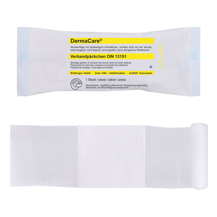 Viskose-Vlies mit enorm hoher Saugfähigkeit von 2.000 g/m² und beidseitigem hydrophilen PP-Antihaftvlies. DermaCare® hat eine absolut glatte Oberfläche, ist hypoallergen, physiologisch unbedenklich, frei von chemischen Bindemitteln. EO-sterilisiert, steril in Peelpackung, Farbcode gelb. DermaCare® Kompresse, aufgesiegelt auf elastische WS-Fixierbinde, stranguliert nicht. SÖHNGEN® No-Touch-Wicklung. Einzeln steril verpackt. Binde ca. 4 m (ged.) x 10 cm, Kompresse ca. 10 x 12 cm.