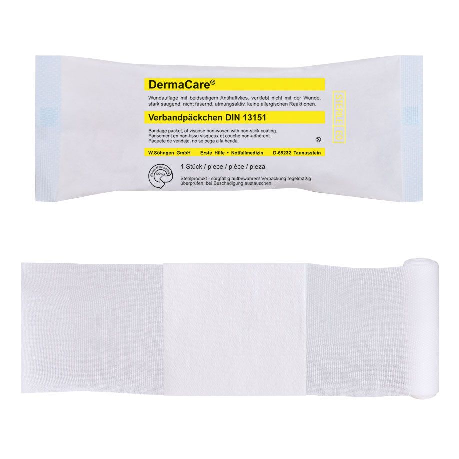 Viskose-Vlies mit enorm hoher Saugfähigkeit von 2.000 g/m² und beidseitigem hydrophilen PP-Antihaftvlies. DermaCare® hat eine absolut glatte Oberfläche, ist hypoallergen, physiologisch unbedenklich, frei von chemischen Bindemitteln. EO-sterilisiert, steril in Peelpackung, Farbcode gelb. DermaCare® Kompresse, aufgesiegelt auf elastische WS-Fixierbinde, stranguliert nicht. SÖHNGEN® No-Touch-Wicklung. Einzeln steril verpackt. Binde ca. 3 m (ged.) x 6 cm, Kompresse ca. 6 x 8 cm.