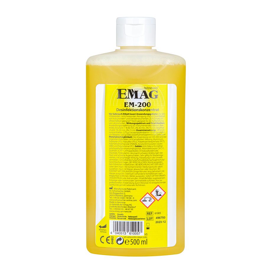 Desinfektionskonzentrat für Instrumente. Es entfernt Amalgan-, Gewebe- und Knochenreste, Speichel, Blut, Proteine. Kurzzeitdesinfektion bei gleichzeitiger Reinigung. EM-200 eignet sich gut zur Desinfektion von chirurgischem Instrumentarium aller Art, inkl. Instrumenten aus der MI-Chirurgie, Anästhesie-Material und flexiblen und starren Endoskopen.