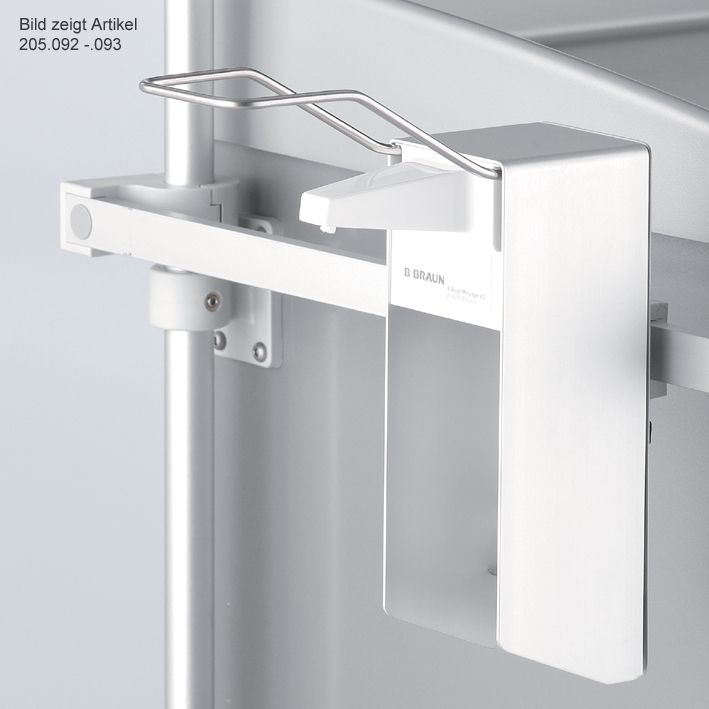 zur Aufnahme von 1000 ml-Behälter, Pumpe aus Edelstahl, mit Befestigungsplatte aus Stahlblech, pulverbeschichtet weißaluminium RAL 9006 und Schienenkloben aus Kunststoff, Nutzmaß 100 mm