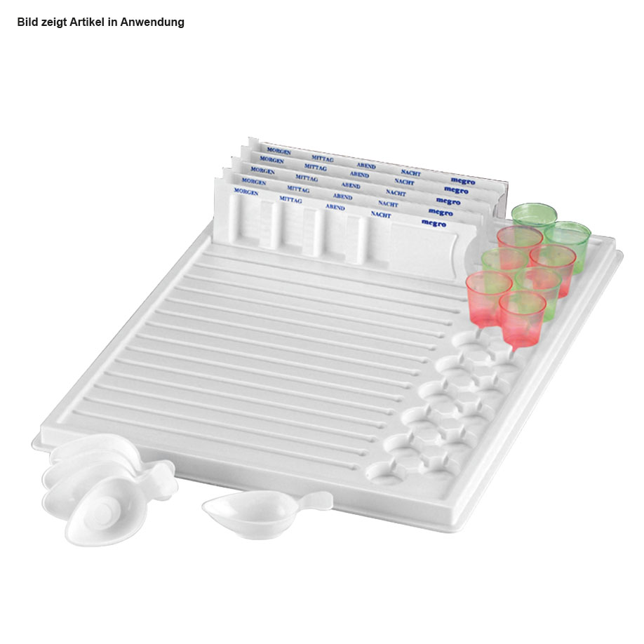 Maße (L x B x H): 440 x 340 x 15 mm, für 19 Einnehmebecher und 19 Dispenser, weiß, aus Polystyrol