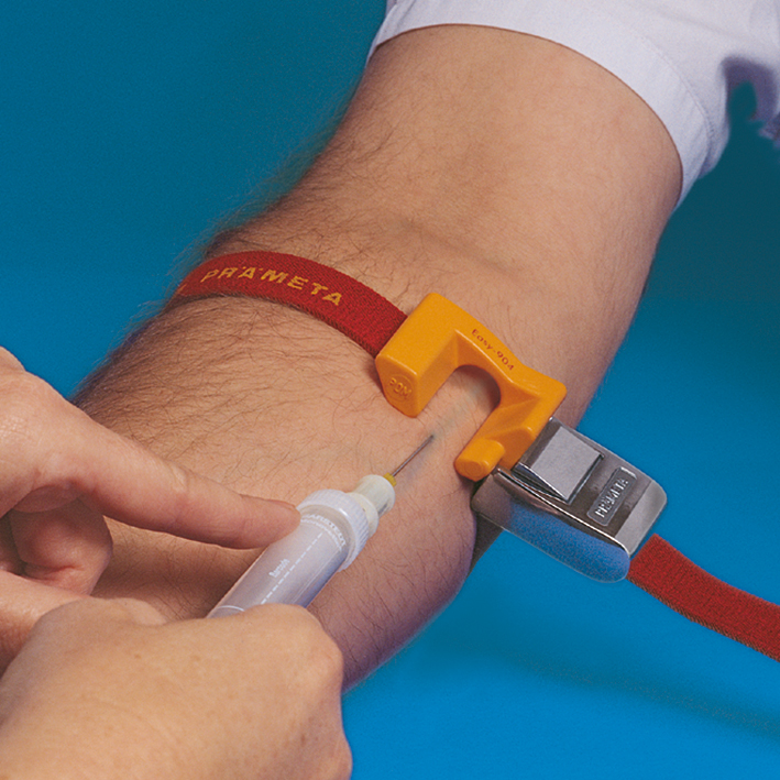 Einfache und schnelle Entnahme von ungestautem Blut aus offener Vene. Die zusätzliche Lösung für Problemfälle. Das neuartige Spezialelement fixiert die zu punktierende Vene. So können Problemvenen nicht mehr ausweichen und Infusionen werden sicher angelegt. Neu ist das Stauen in der Punktionsebene. Die gewählte Vene bleibt ungestaut, aber durch erhöhten Durchfluß und Volumen ist sie leicht punktierbar. Dadurch kann die Injektion sofort in den Kreislauf gelangen. Auch Blutentnahme - sogar mit dicken Kanülen - ist so möglich, ohne den Staudruck zu reduzieren - kein hämolytisches Serum.