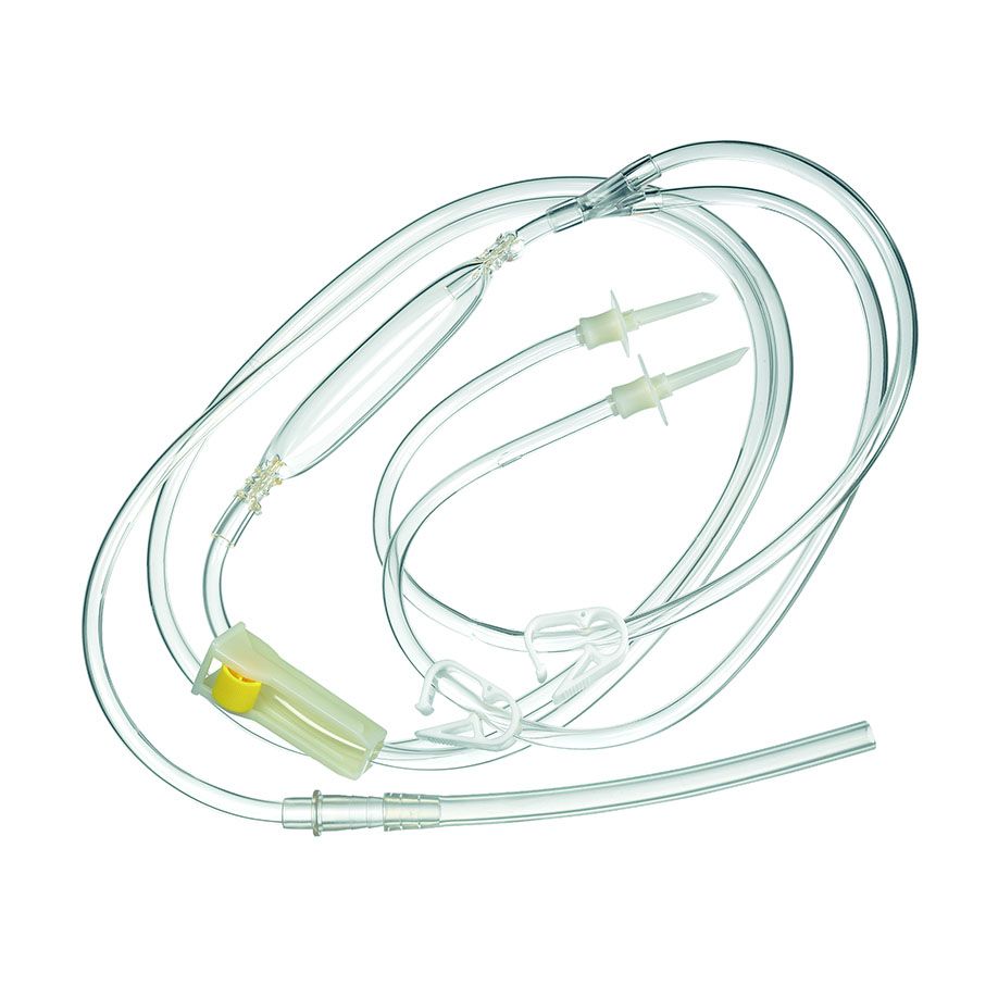 Zwei Ecospike-Einstechdorne, zwei Rastklemmen, Y-Verbindungsstück, Tropfkammer, Rollklemme, Urologenkonus mit 15 cm Silikonschlauch als Ansatz für Resektoskope