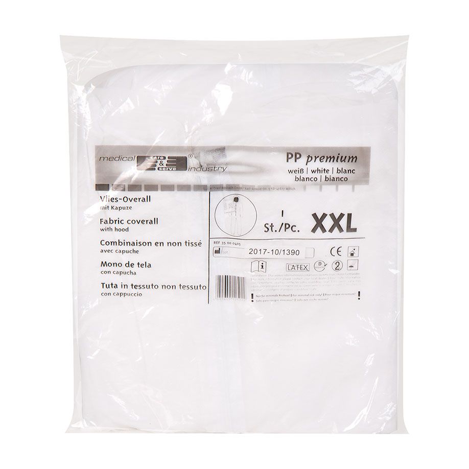 PP-Vlies, antistatisch, Reißverschluss vorn, Beine, Ärmel und Kapuze mit Gummizug.