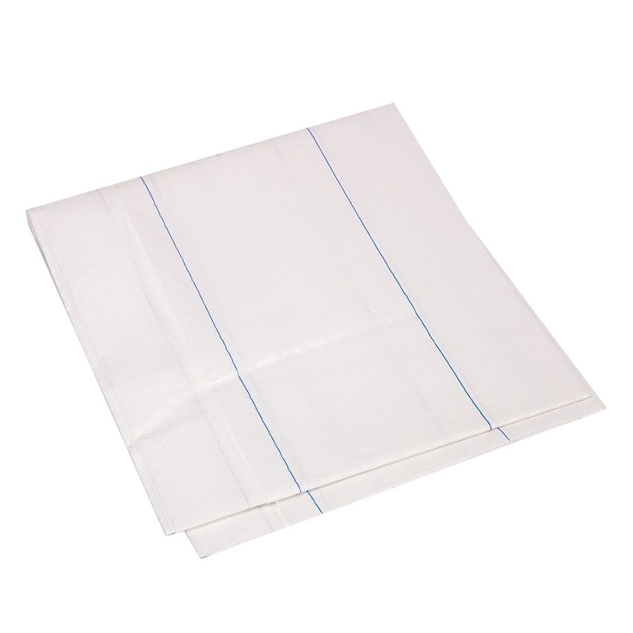 Weicher Qualitäts-Vliesstoff, weiß, fadenverstärkt, stabil und strapazierfähig, praxisgerechte Faltung. Gut aufsaugend, Flüssigkeitssperre durch PE-Folienbeschichtung.
