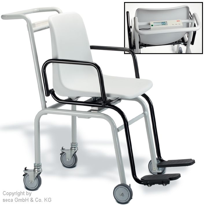 Die seca 956 erfüllt mit einer Tragkraft von 200 kg und einer Teilung von 100 g alle Grundstandards medizinischer Anforderungen. Mit klappbaren Arm- und Fußstützen, mit sicherer Radfeststellbremse, mit ergonomisch geformter Sitzschale und mit besonders leichtgängigen Rollen. Natürlich hat die seca 956 die wichtige Funktion TARA, die es erlaubt, jedes neu hinzugefügte Gewicht separat zu wiegen und HOLD, die es dem Personal gestattet, sich erst um den Patienten zu kümmern und dann das Messergebnis abzulesen.