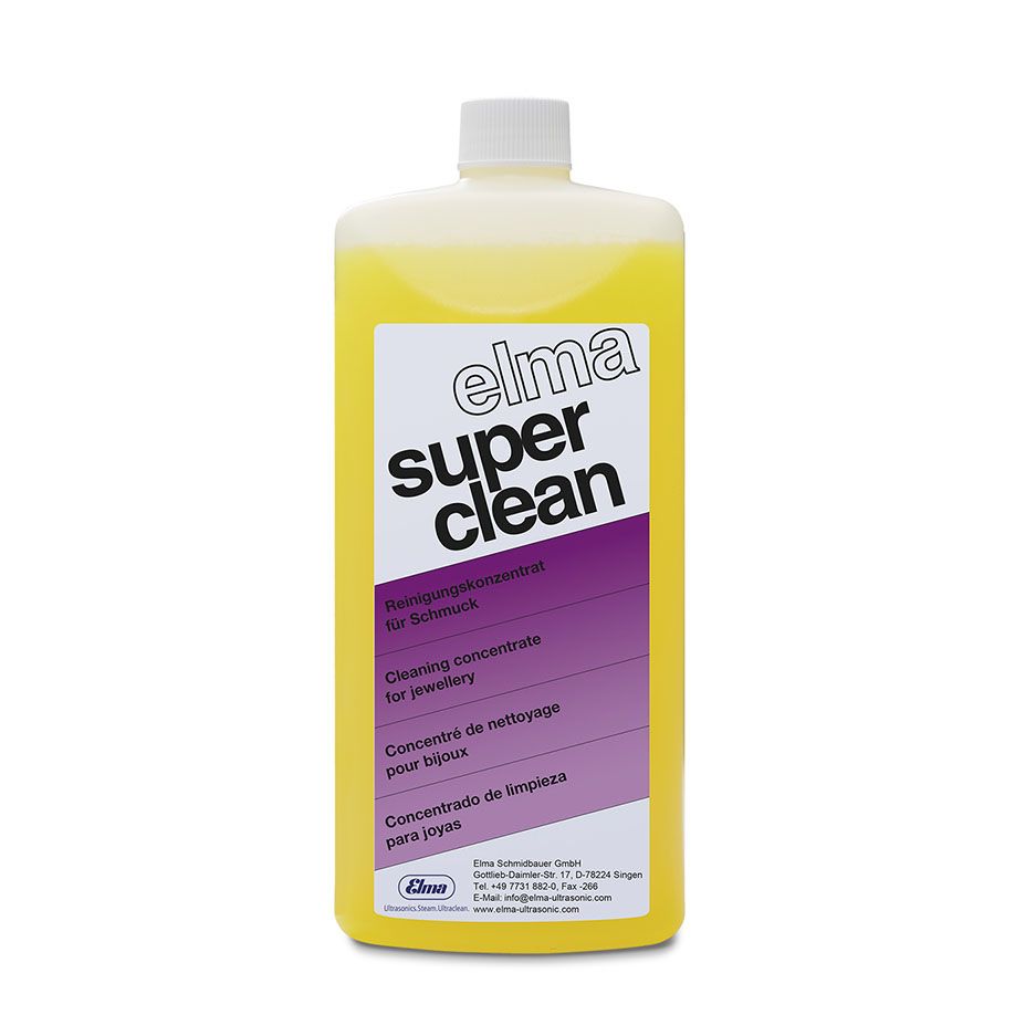 elma super clean ist ein wässriges ammoniakalisches Schmuckreinigungskonzentrat für eine schonende Reinigung und Aufhellung. Als Ultraschallreiniger universell für Gold, Silber und Schmuck mit Edelsteinen. Anwendbar für alle harten Schmucksteine. Angelaufene Stellen auf Gold, Silber bzw. ihren Legierungen werden aufgehellt, die Schmuckstücke entfettet, Emulsionen, Staub und Schweißrückstände entfernt.