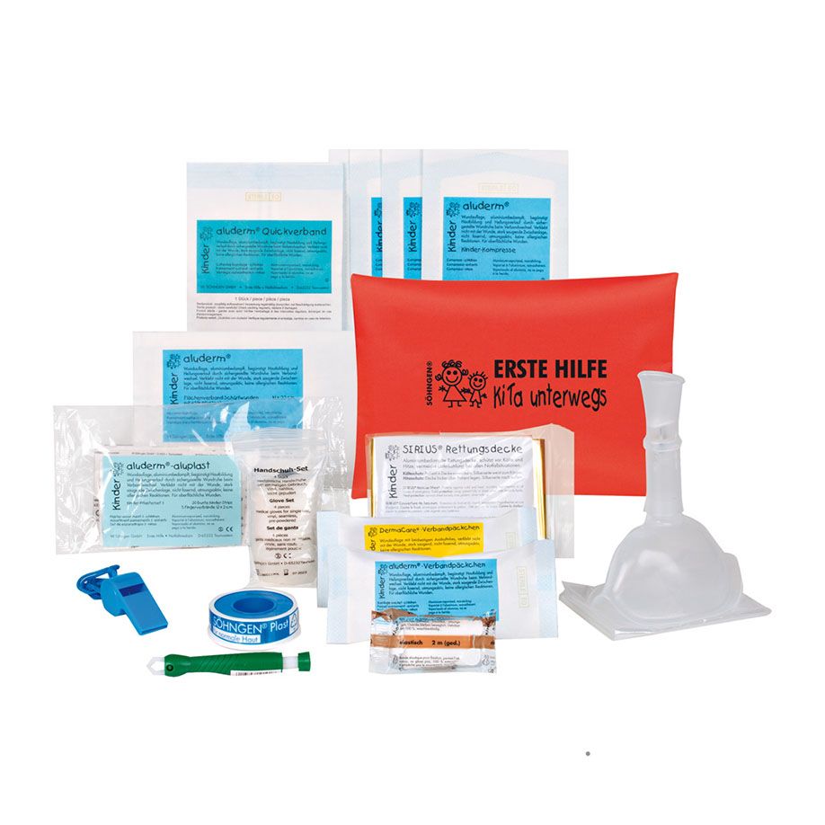 Praktisches Mitnahmeset für Kindergärten und Kindertagesstätten bei kleinen Ausflügen, für die Erste Hilfe unterwegs. Enthält aluderm® und DermaCare® Kinderverbände in kleinkindgerechten Größen und Abmessungen für das Kindergartenalter, weiterhin eine SIRIUS® Rettungsdecke, eine Zeckenpinzette und eine Signalpfeife. Reißverschlusstasche aus beschichtetem Nylongewebe, Taschengröße ca. 240 x 170 mm. Robust, leicht, weich, wenig Platzbedarf. Bedruckt mit Kindermotiv und Beschriftung.