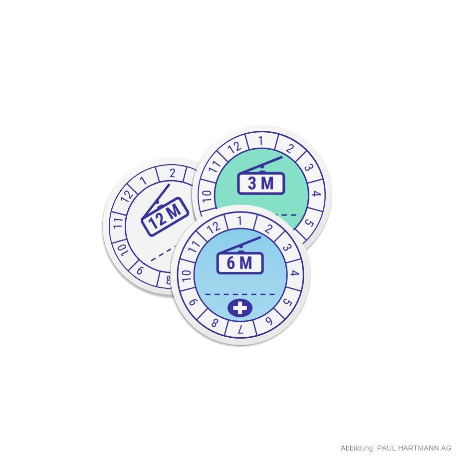 - Etiketten zur Kennzeichnung des Anbruchdatums für eine 12-monatige Verwendbarkeit von Händedesinfektionsmitteln und gebrauchsfertigen Desinfektionstüchern; zusätzlich besteht die Möglichkeit, das Jahr zu notieren