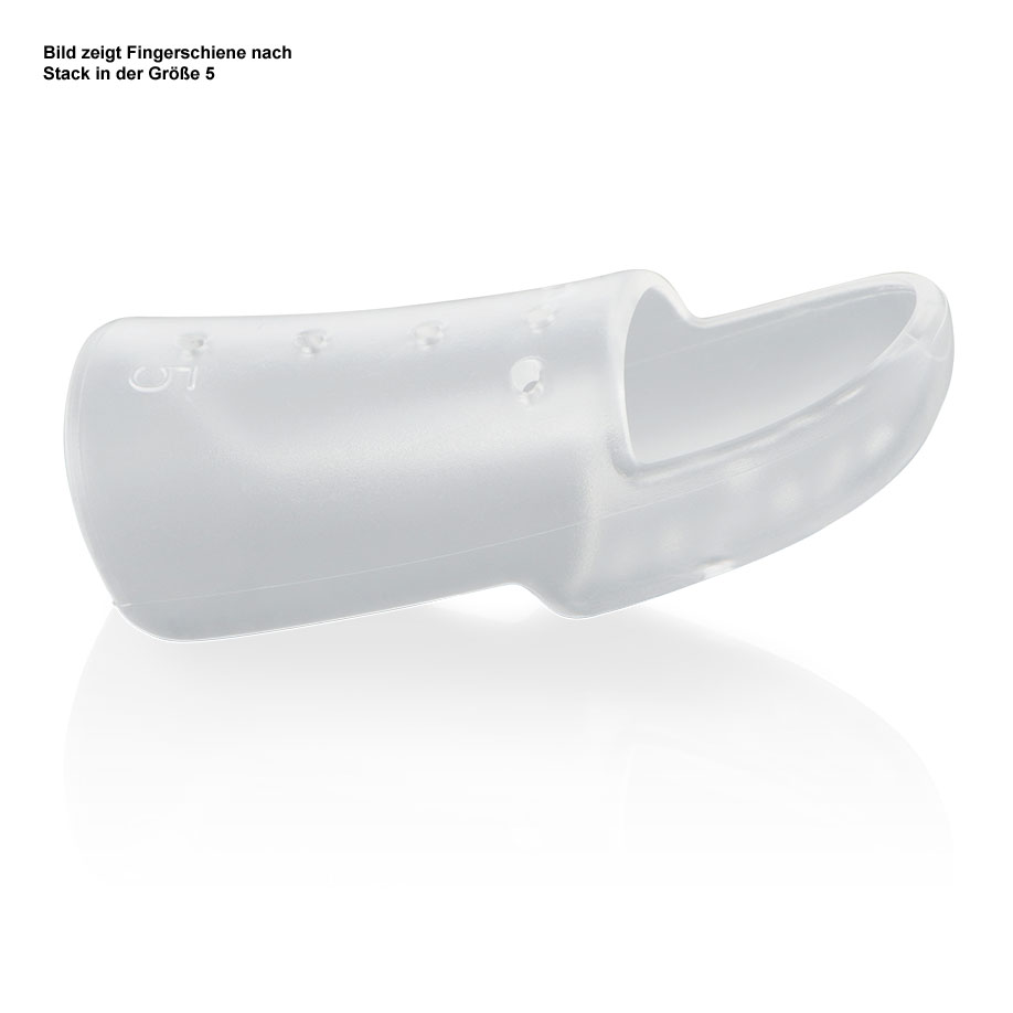 Indikationen: Strecksehnenabriss, Fingerspitzen- und Nagelbettverletzungen. Dient zur Fixierung des distalen Fingergelenkes in Extensionsstellung. Die Kappe über der Phalanx media wird vorzugsweise mit dem Velcro-Straps fixiert. Das proximale Interphalangealgelenk liegt frei. Die Wandung der Schiene ist zwecks Luftzufuhr perforiert. Länge: 6,2 cm, Fingerumfang: 4,5 cm.