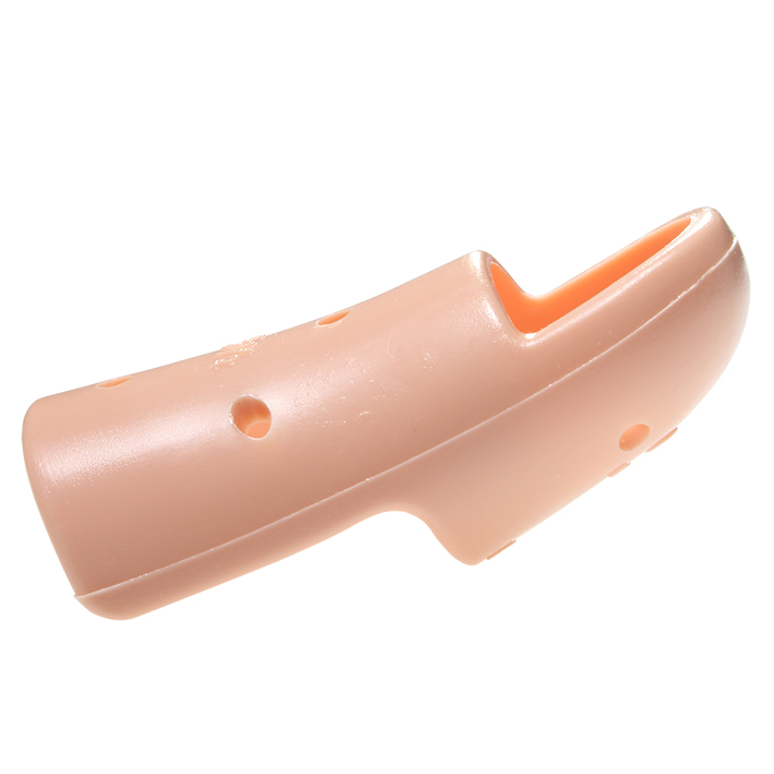 Indikationen: Strecksehnenabriss, Fingerspitzen- und Nagelbettverletzungen. Dient zur Fixierung des distalen Fingergelenkes in Extensionsstellung. Die Kappe über der Phalanx media wird vorzugsweise mit dem Velcro-Straps fixiert. Das proximale Interphalangealgelenk liegt frei. Die Wandung der Schiene ist zwecks Luftzufuhr perforiert. Länge: 6 cm, Fingerumfang: 7 cm.