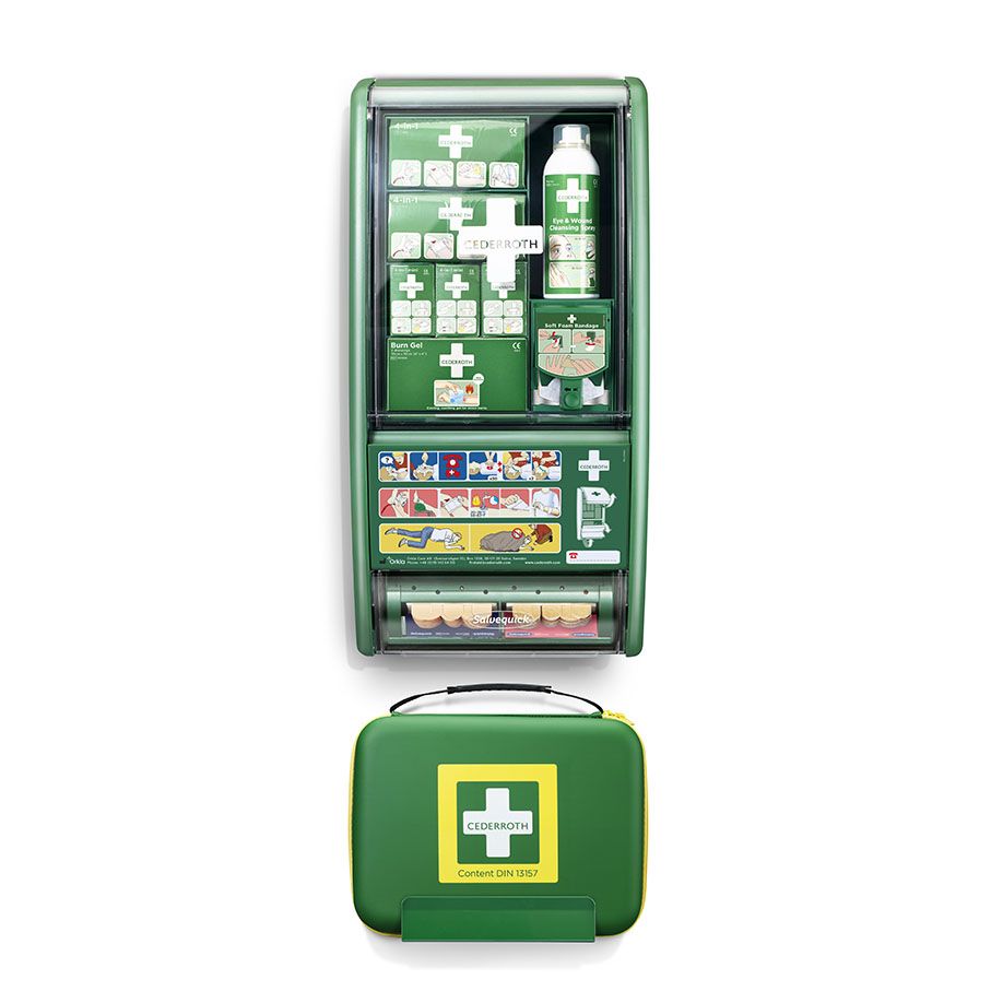 Cederroths Erste Hilfe Station kann mehrere Arten von Verletzungen behandeln. Ferner lässt sich die Station an unterschiedliche Einsatzbereiche anpassen. Inkl. Wandhalterung.