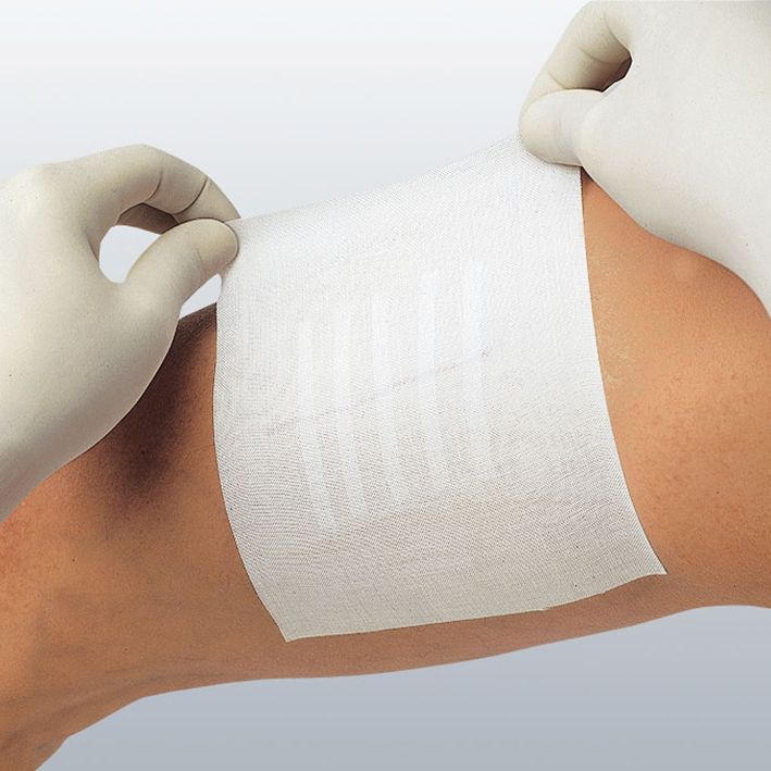 - zur vollflächigen Fixierung von Wundauflagen, besonders für großflächige Wundauflagen an wenig konturierten Körperpartien