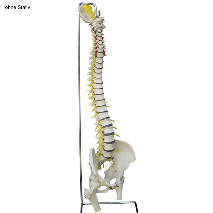 Abguß einer echten menschlichen Wirbelsäule (ca. 80 cm). Alle Details sind hervorragend dargestellt, mit Hinterhauptbein, Nerven, Arterien und beweglichen Oberschenkelstümpfen. Voll flexibles Modell: Verkrümmungen, Verspannungen und sonstige pathologische Erscheinungsformen können dargestellt werden. Das Kreuzbein ist auf der Rückseite durch eine Knochenklappe eröffnet, um den Verlauf der Nerven innerhalb des Knochens zu zeigen.