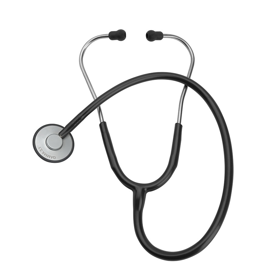 Stethoskop, das sich mit seinem massiven Aluminium-Flachbruststück einfach und angenehm unter die Manschette des Blutdruckmessgeräts schieben lässt.